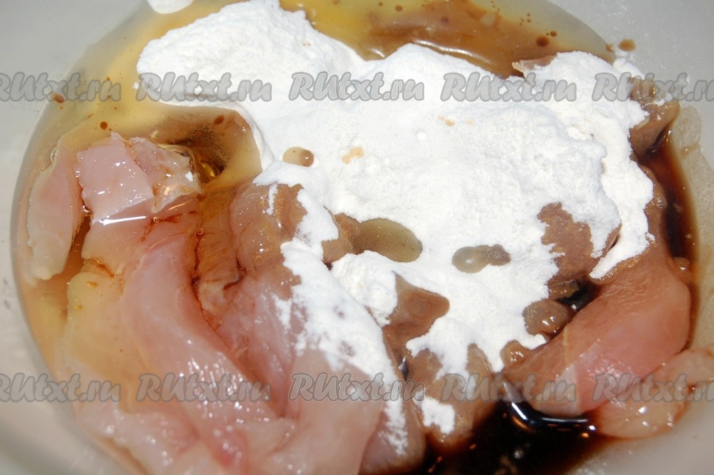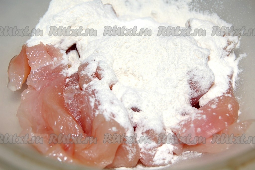 Выложить кусочки курицы в миску, посыпать мукой.