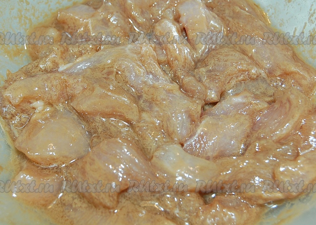 Перемешать кусочки курицы в полученном маринаде и оставить мариноваться 20 минут.