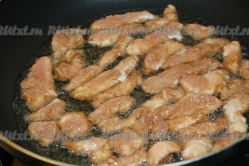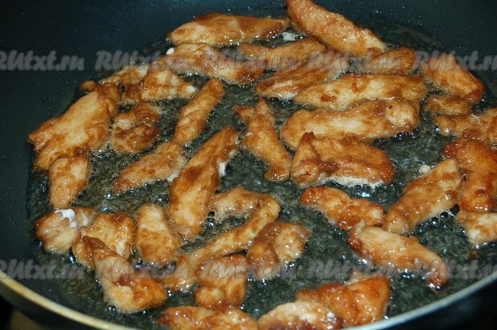 Затем обжарить кусочки курицы с двух сторон до полной готовности.