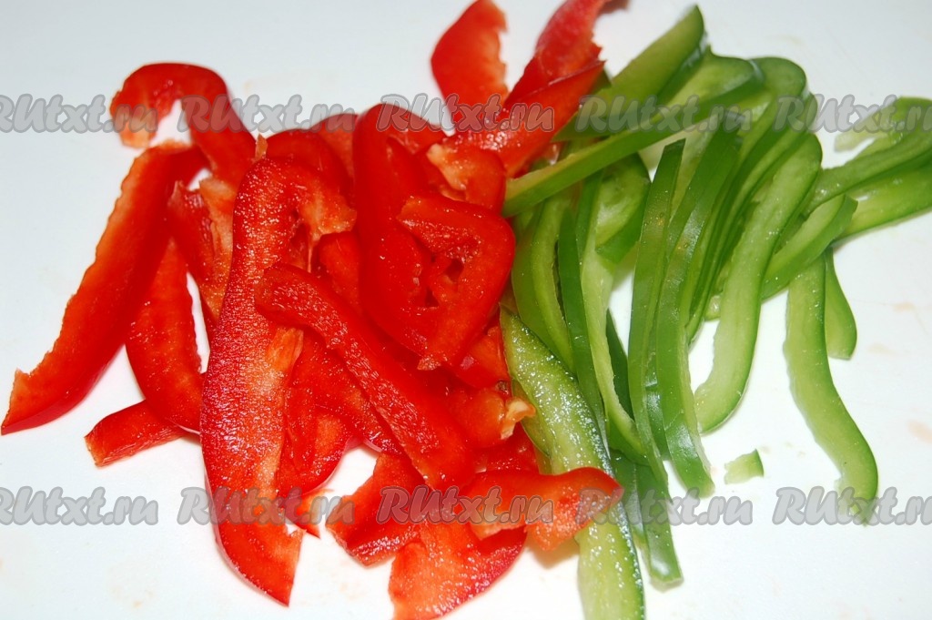 Нарезать сладкий перец узкими полосками и отправить к капусте.