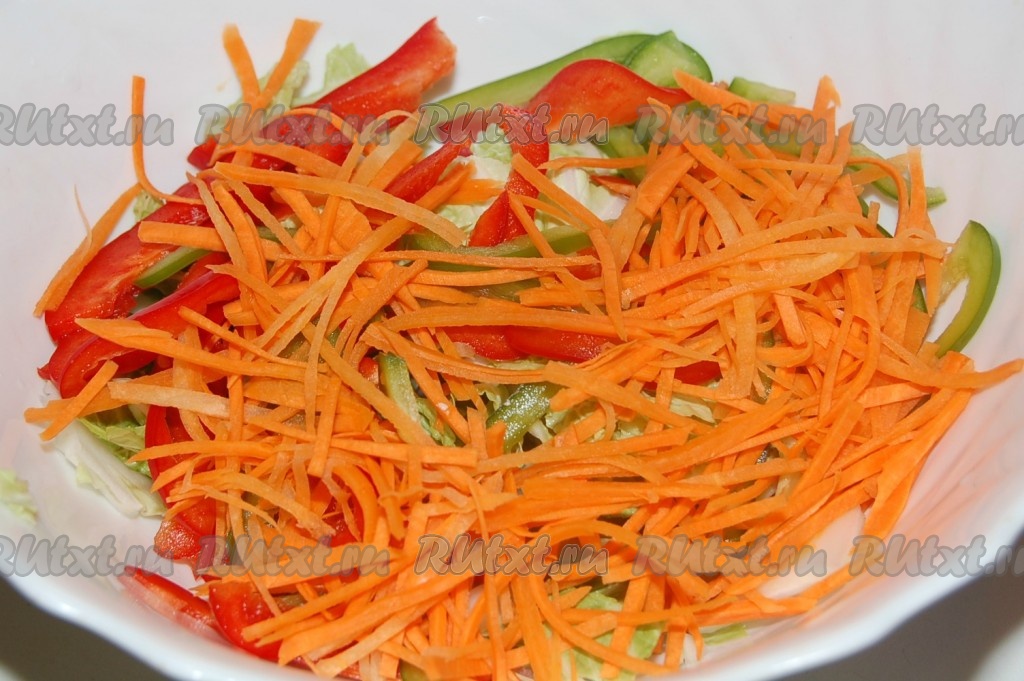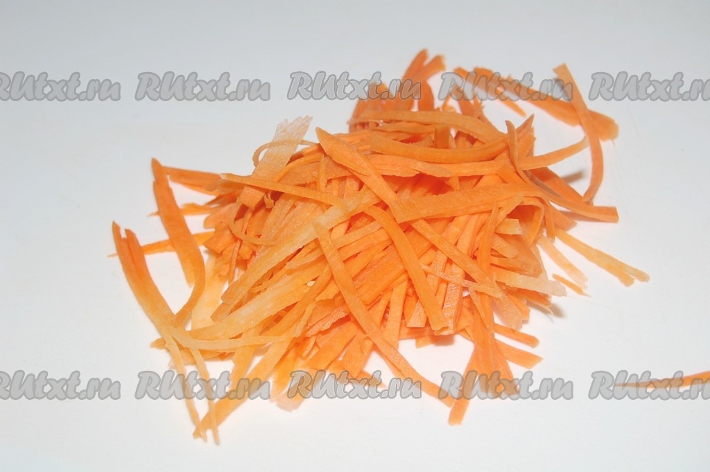 Настругать тонко морковь и отправить ее в салатник.