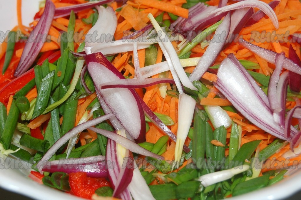 Красный лук нарезать тонко и тоже отправить к остальным овощам.