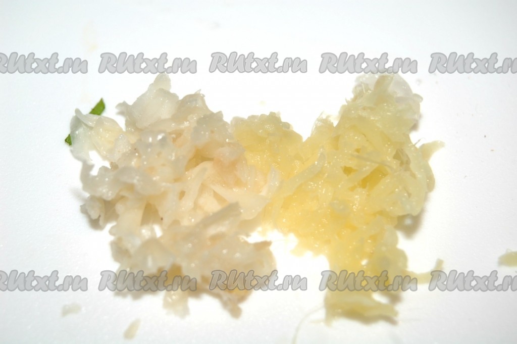Для заправки салата измельчить свежий имбирь и чеснок.