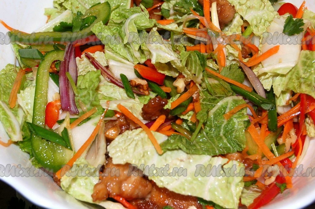 Добавить к овощам кусочки курицы и полученной заправкой заправить китайский салат. Аккуратно, чтобы не поломать овощи, салат перемешать.