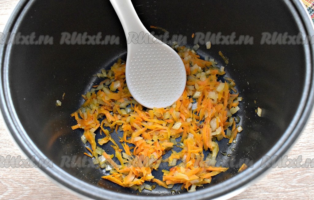 В чашу мультиварки наливаем масло. Включаем на дисплее режим «Жарка». В чашу перекладываем измельчённые морковь и лук. Периодически перемешивая лопаточкой, обжариваем овощи 5-7 минут (до мягкости).