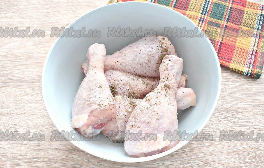 Куриные голени промываем и сразу же обсушиваем их с помощью бумажных полотенец. Перекладываем голени в миску, по вкусу солим, перчим, перемешиваем.