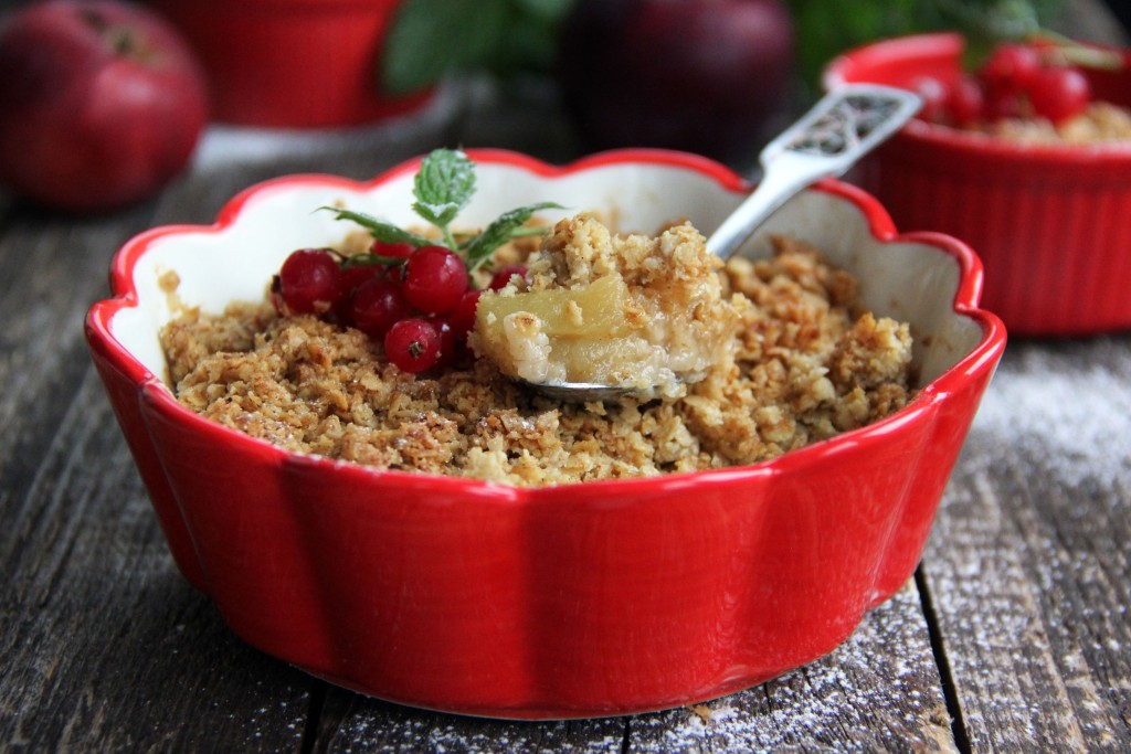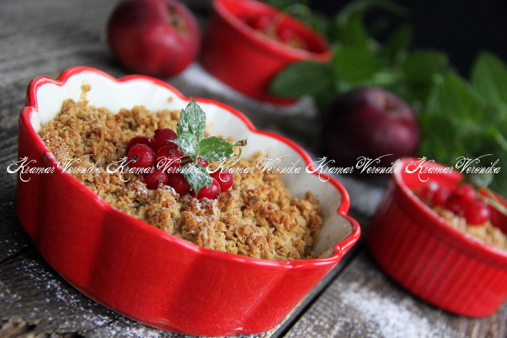 Яблочный крамбл, приготовленный с овсяными хлопьями, к столу подавать горячим, по желанию, украсив свежими ягодами или дополнив мороженым. И вкусно, и полезно, попробуйте!