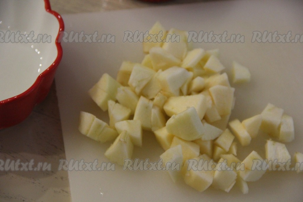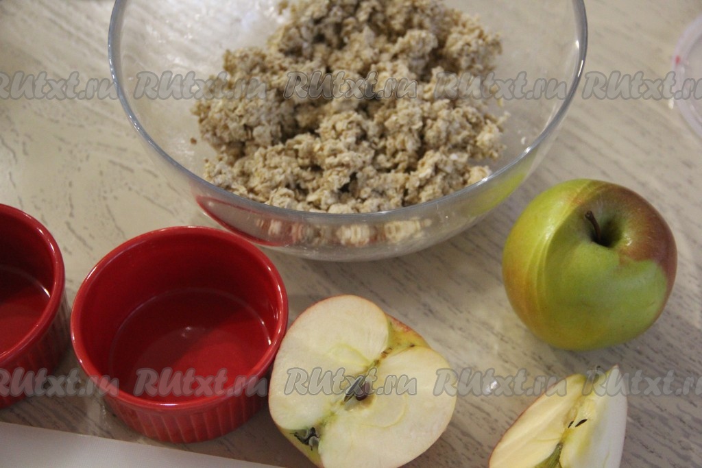 Готовить яблочно-овсяный крамбл можно в одной форме или в нескольких формочках. Я выпекала в керамическая формочках. Форму (или формочки) можно немного смазать маслом. На дно формочек выложить яблоки.