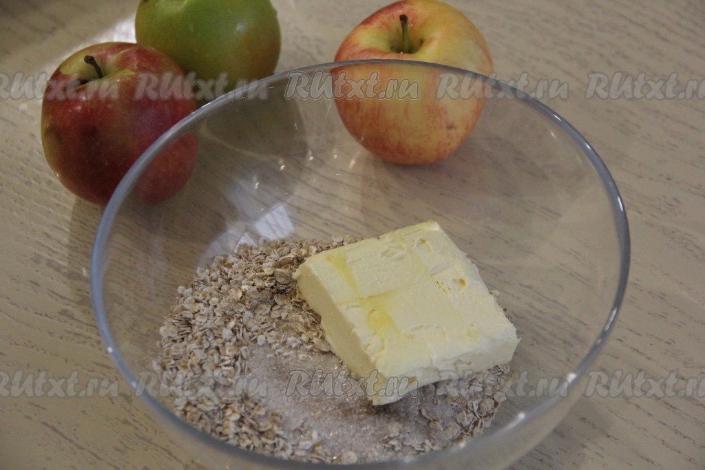 Перетереть масло с хлопьями и сахаром с помощью вилки в крошку. Яблоки вымыть, очистить от кожуры и сердцевинки.