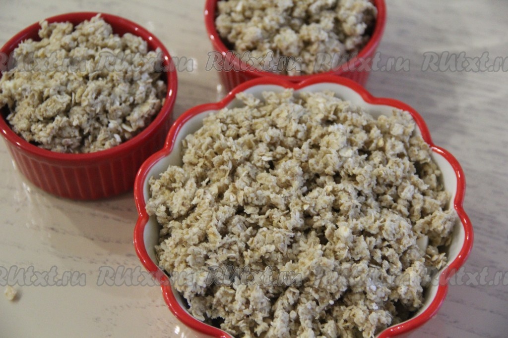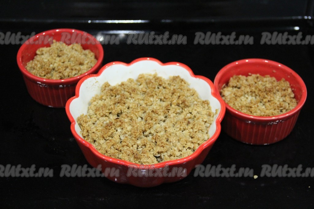 Поставить формочки в разогретую до 200 градусов духовку и готовить крамбл из яблок и овсяных хлопьев, примерно, 30 минут (до слегка золотистого цвета).