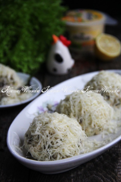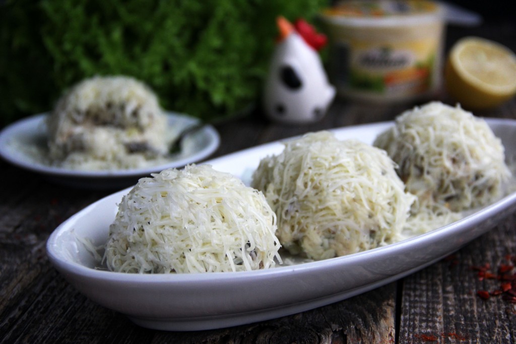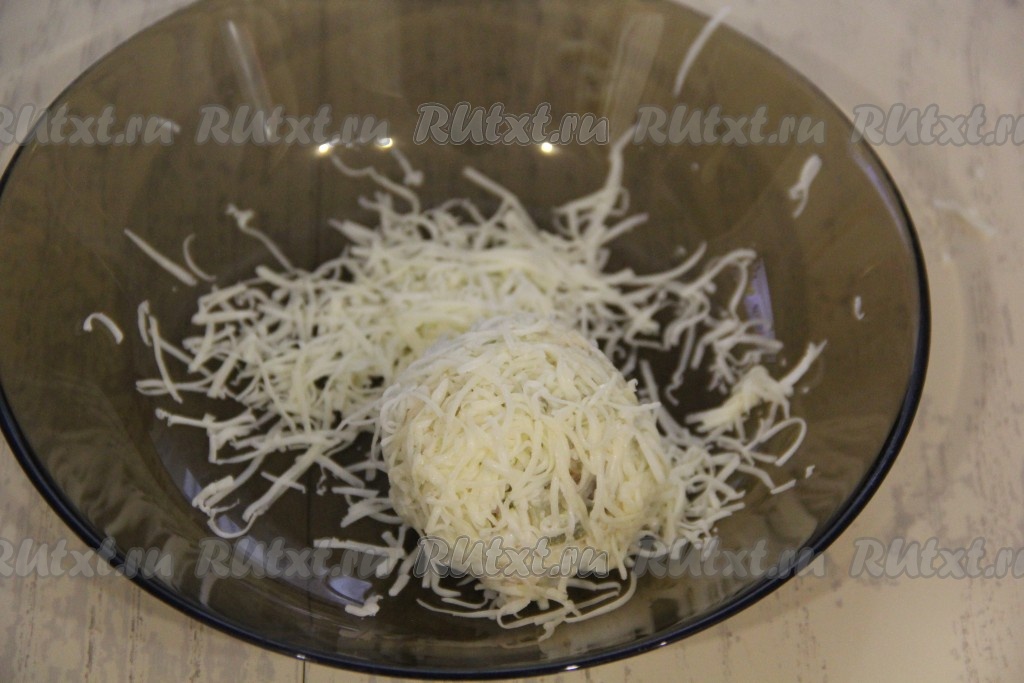 Сыр натереть на мелкой (или средней) тёрке. Из салатной массы руками сформировать шарики (у меня получилось 8 штук) и обвалять их со всех сторон в натёртом сыре.
