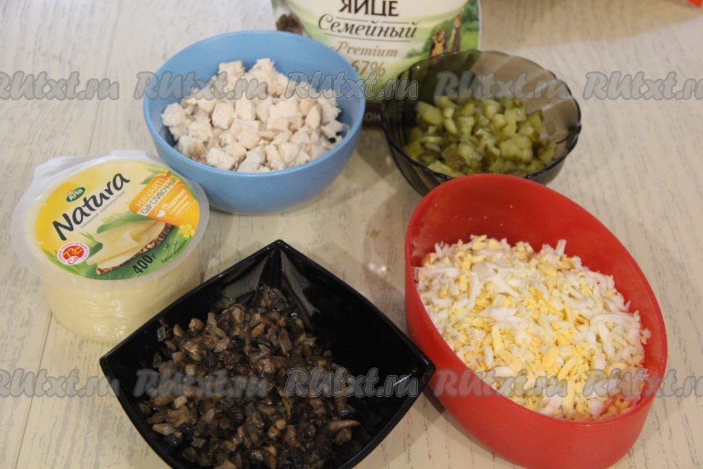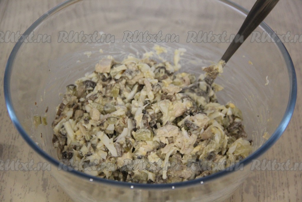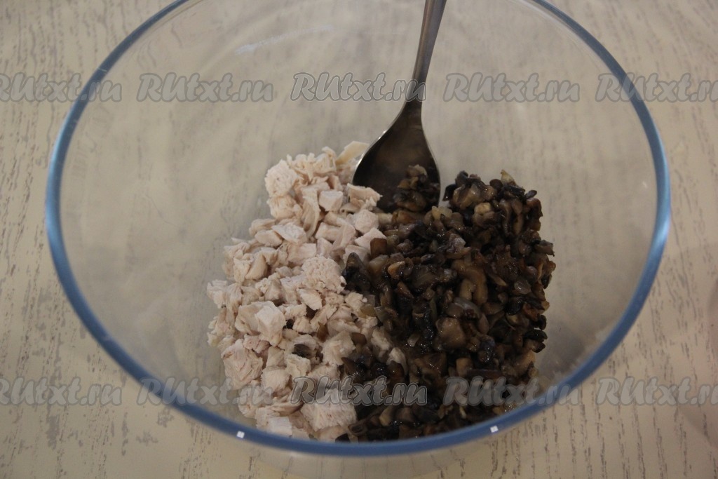 В салатнике соединить курицу и грибы.