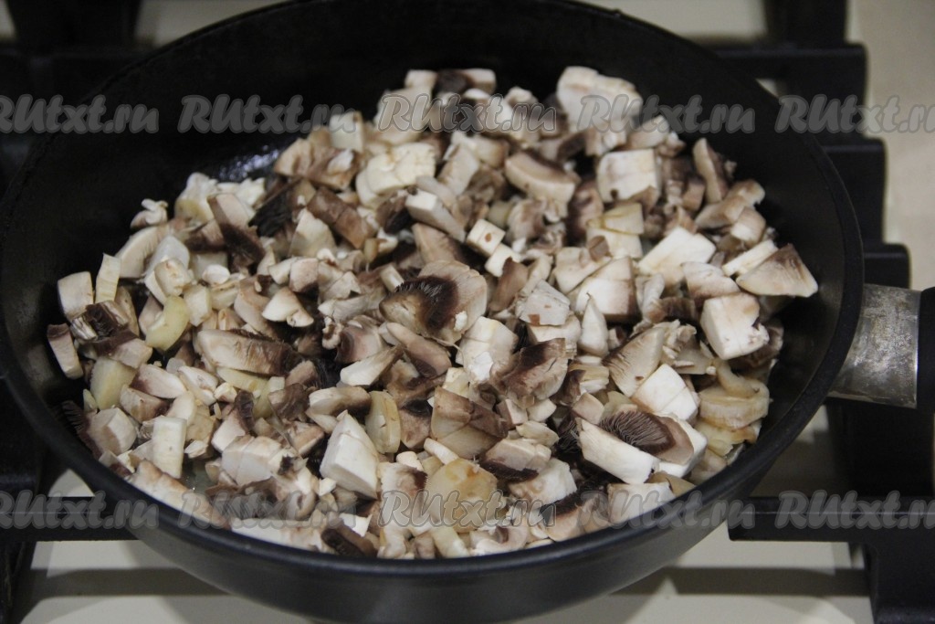 Шампиньоны промыть под водой, нарезать на небольшие пластинки, добавить к обжаренному луку. Шампиньоны обжаривать с луком минут 7 (до готовности грибов), не забывая помешивать. Снять с огня и оставить до полного остывания грибочков.