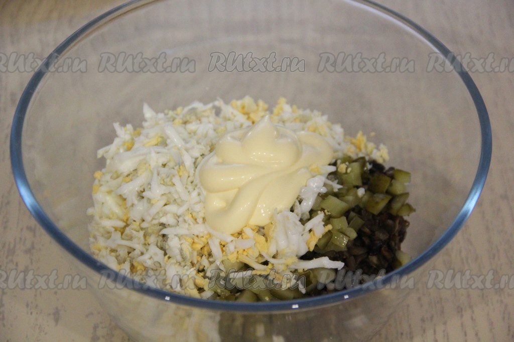 Добавить огурцы, яйца и майонез (много майонеза не добавляйте, салатная масса должна получиться достаточно густой, чтобы она могла держать форму, но при этом масса не должна быть и очень сухой).