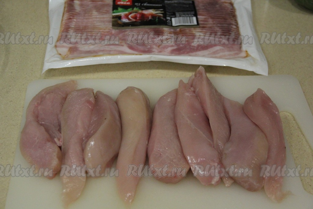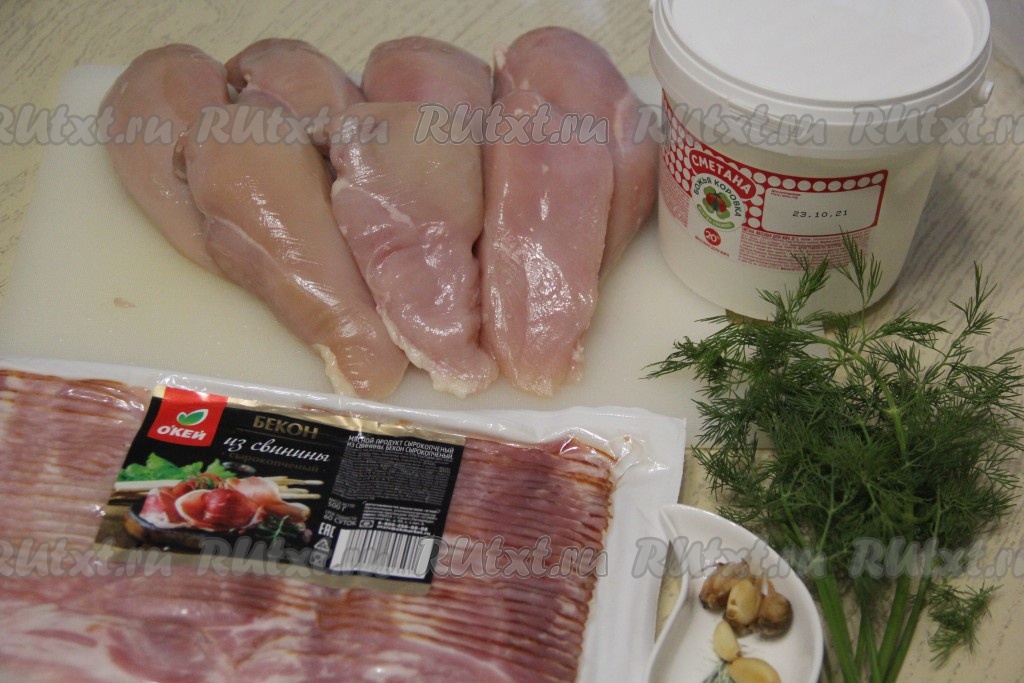 Подготовить продукты. Бекон я купила уже нарезанный на тонкие полоски, если у вас бекон в виде одного куска, то самое время его нарезать на тонкие полоски. Сметану можно взять любой жирности. Куриное филе промыть водой, обсушить.
