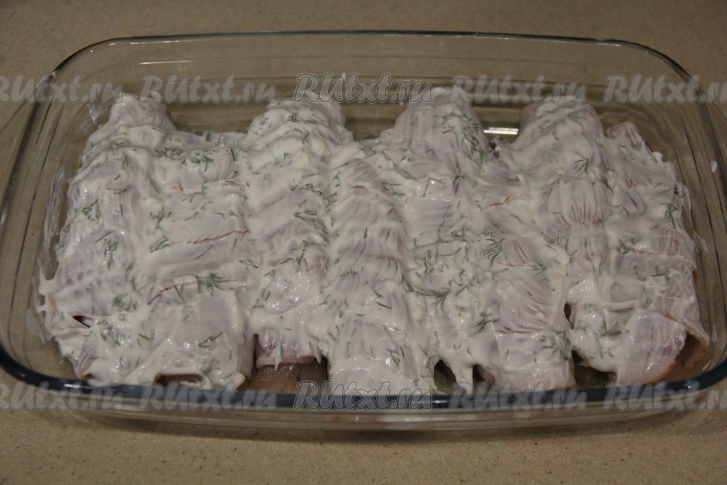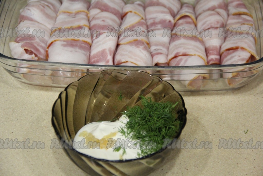 Смесью сметаны, чеснока и зелени смазать мясо в беконе.