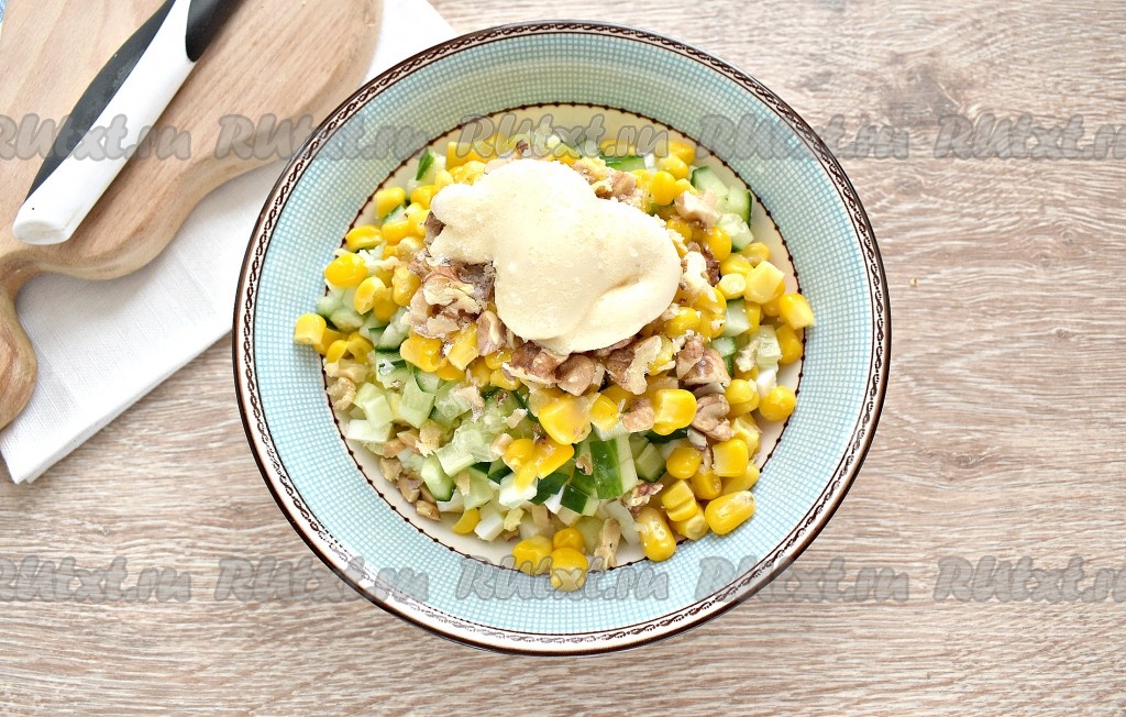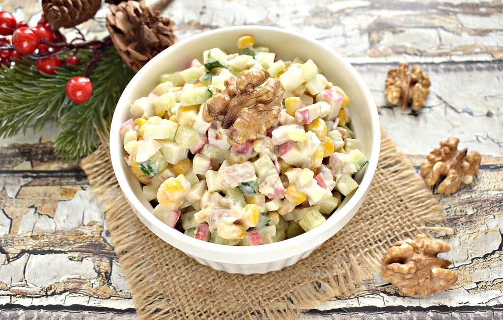 Вкусный, яркий салат с крабовыми палочками и грецкими орехами готов, можно его сразу выставлять на стол.