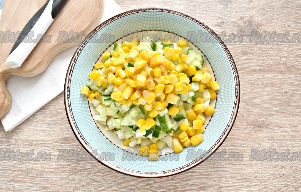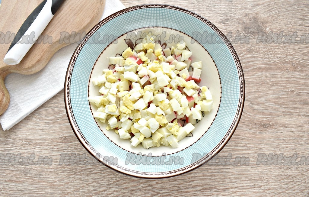 Яйца тоже нарезаем на небольшие кубики (нарезать можно специальной яйцерезкой или ножом), выкладываем к крабовым палочкам.