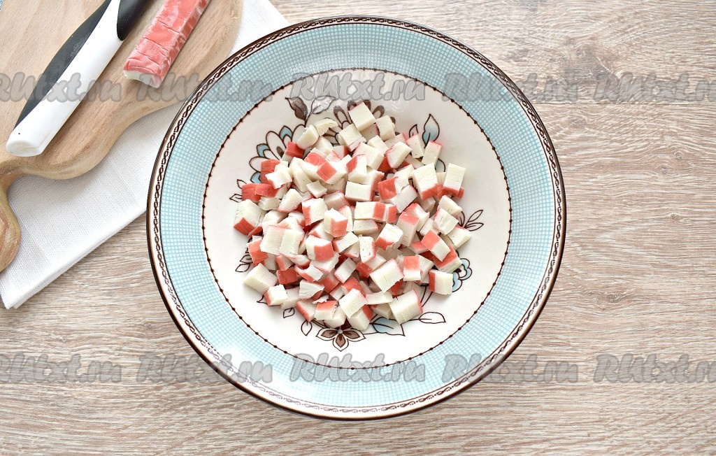 Прежде всего отвариваем яйца вкрутую (варим после закипания воды 8-10 минут), остужаем их в ледяной воде и очищаем. Если крабовые палочки заморожены, им нужно дать разморозиться при комнатной температуре. Удаляем с крабовых палочек упаковку, а затем нарезаем их на небольшие кубики и перекладываем в достаточно глубокую тарелку (или миску).