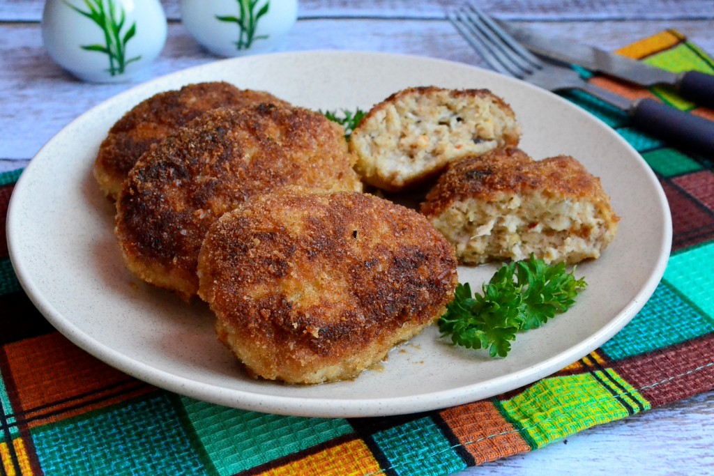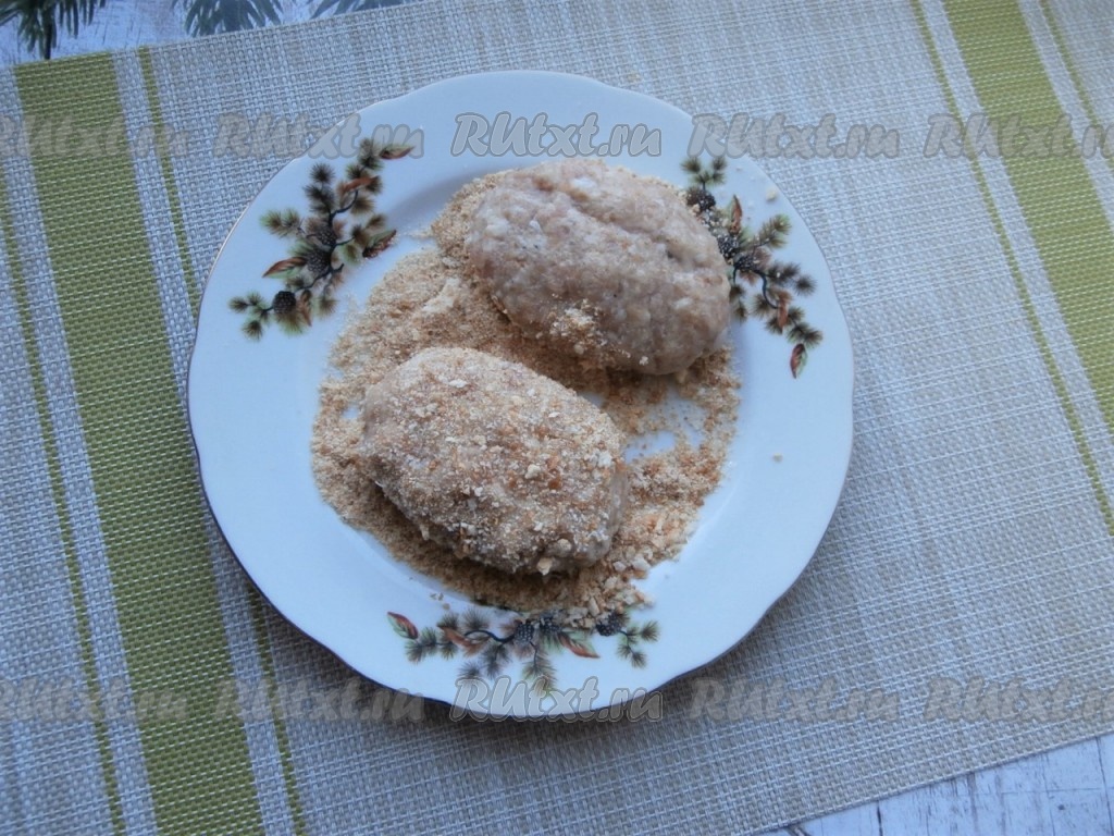 Сформировать влажными руками котлеты среднего размера, обвалять их со всех сторон в сухарях.