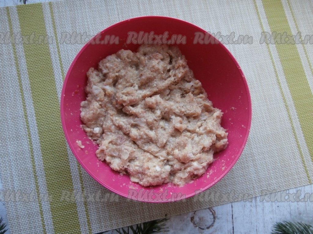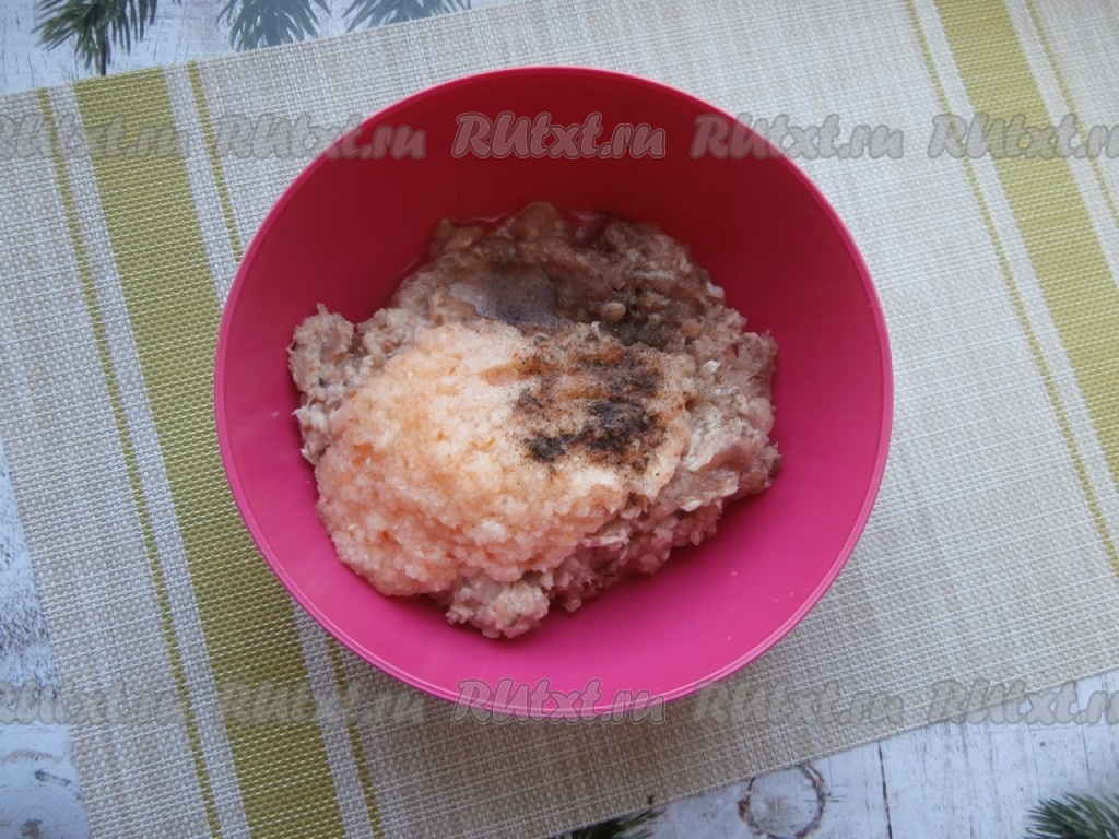В глубокую миску выложить фарш, добавить получившуюся смесь перца и лука, посолить и поперчить.