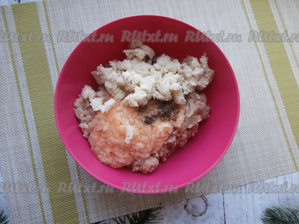 Ломтики белого хлеба вымочить в воде, отжать от лишней жидкости и тоже выложить в миску с фаршем.
