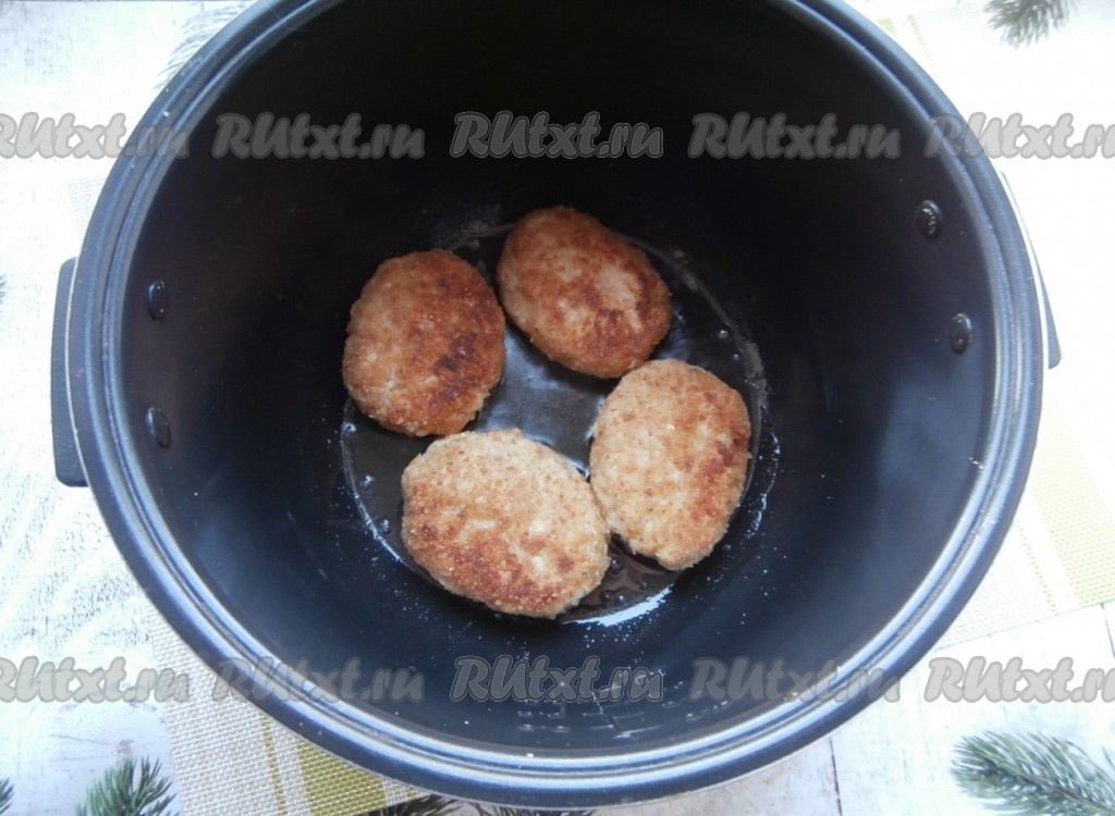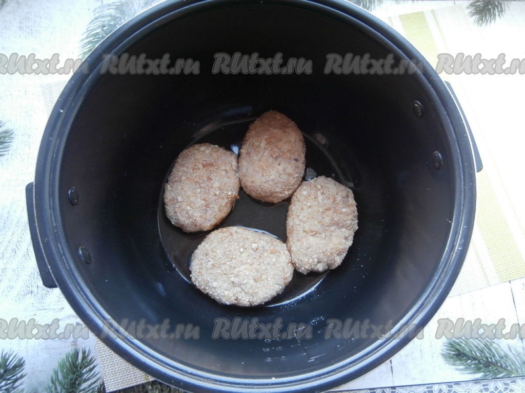 В чашу мультиварки влить растительное масло, выставить режим "Жарка" на 20 минут. Через 5 минут поместить в чашу котлеты.