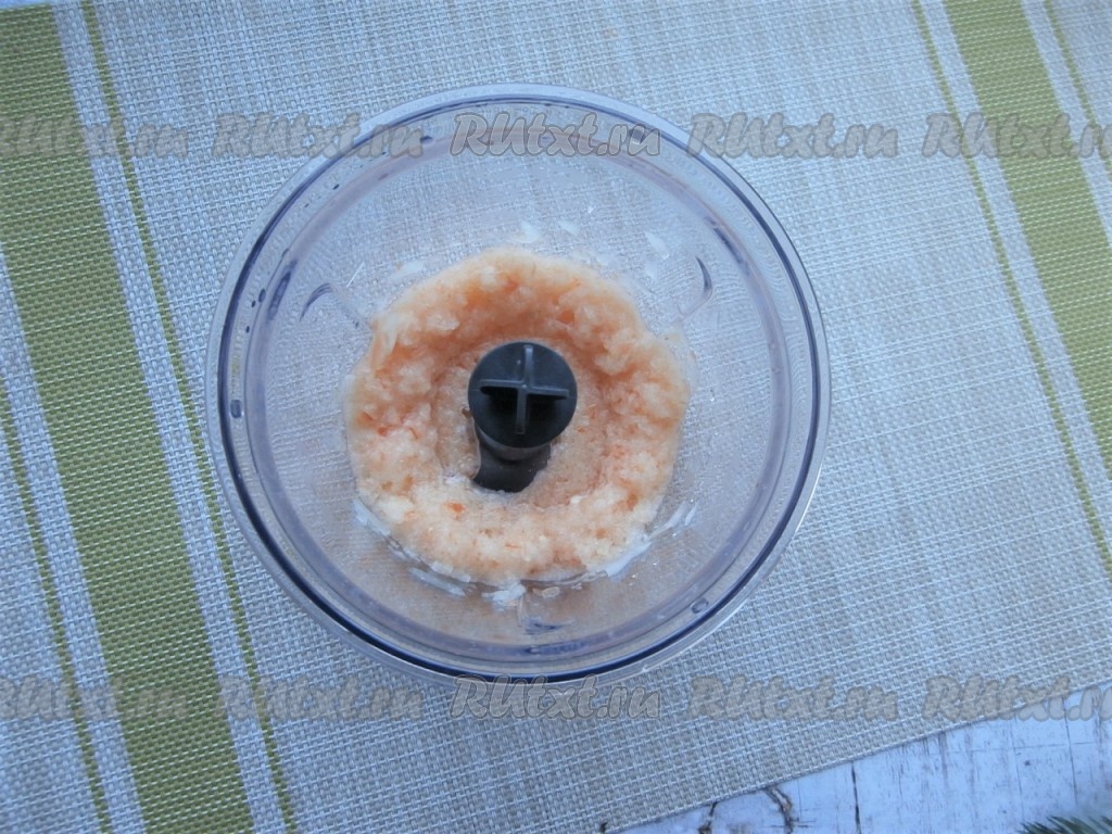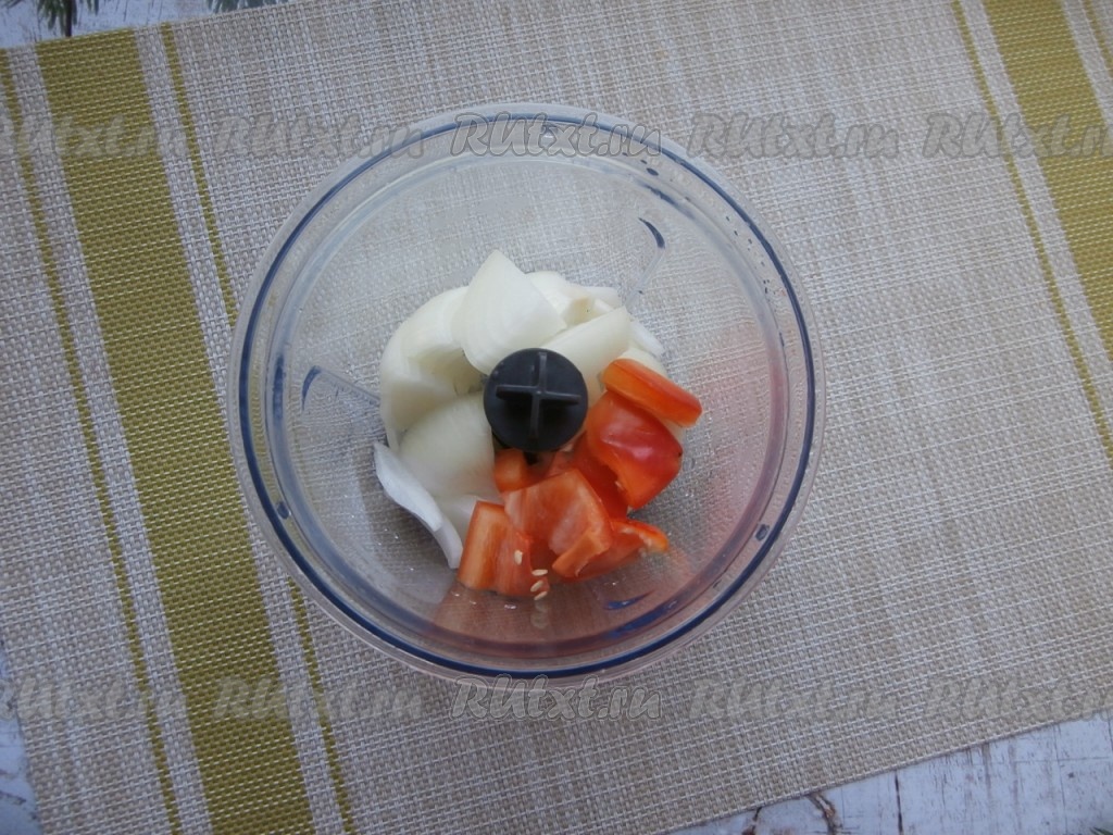 Очистить лук, удалить семечки из болгарского перца. В чашу блендера поместить нарезанные кусочками лук и сладкий болгарский перец.