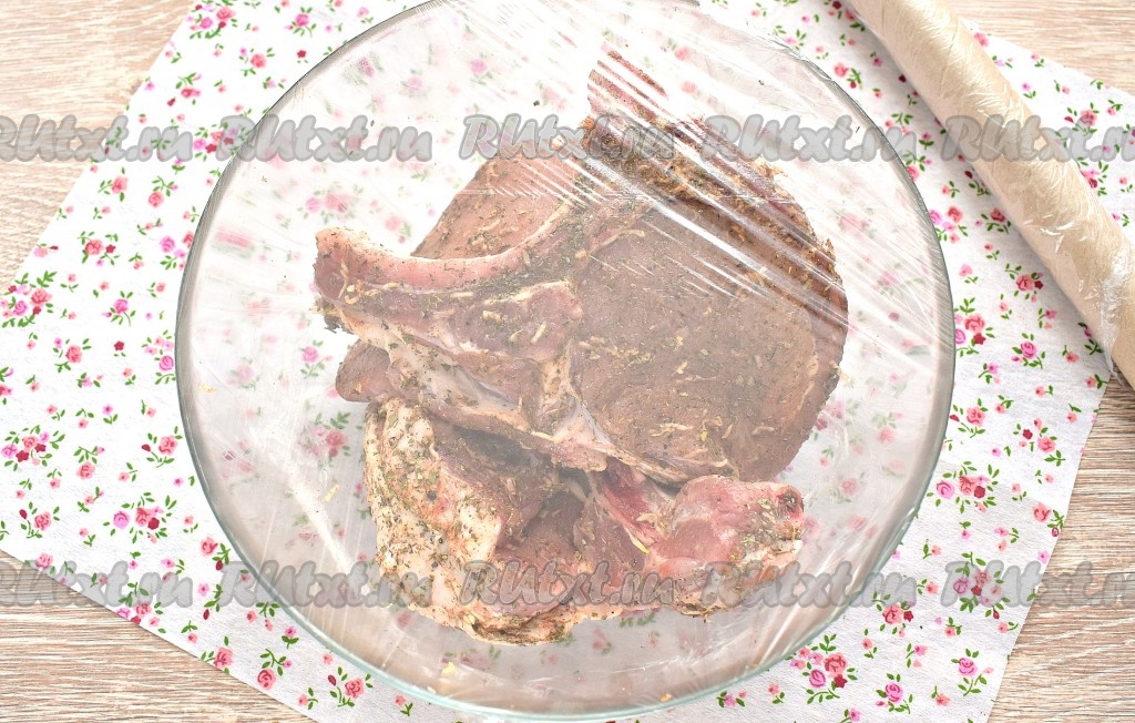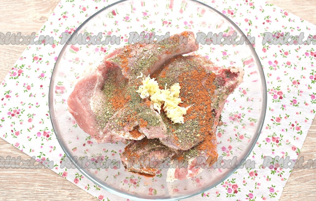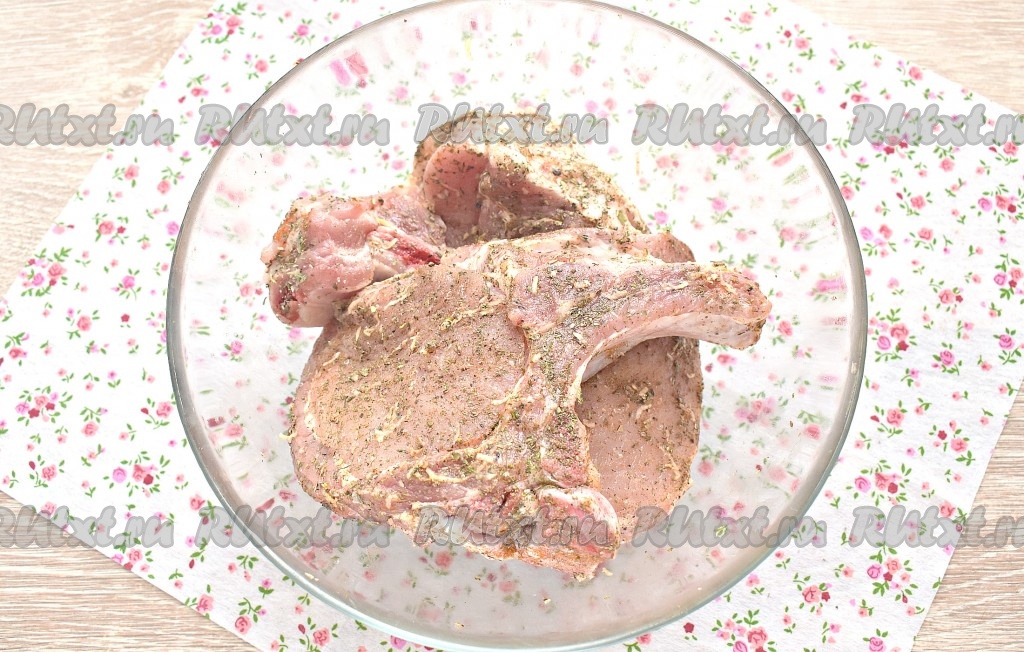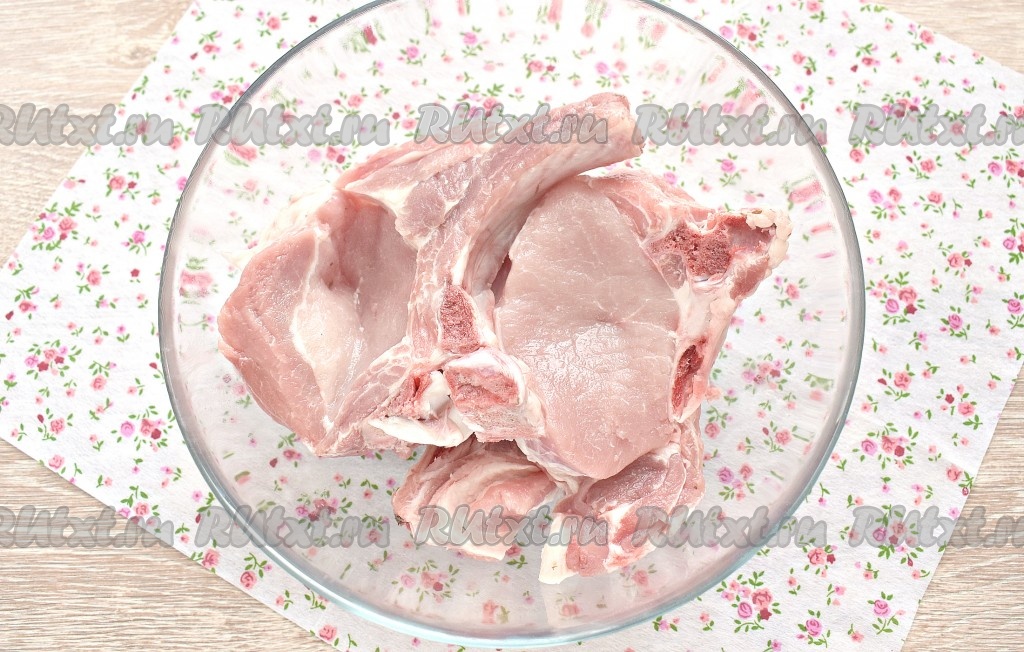 Свинину на кости моем, обсушиваем, нарезаем на порционные кусочки (стейки). У меня получилось 3 стейка. Перекладываем стейки в достаточно объёмную миску.
