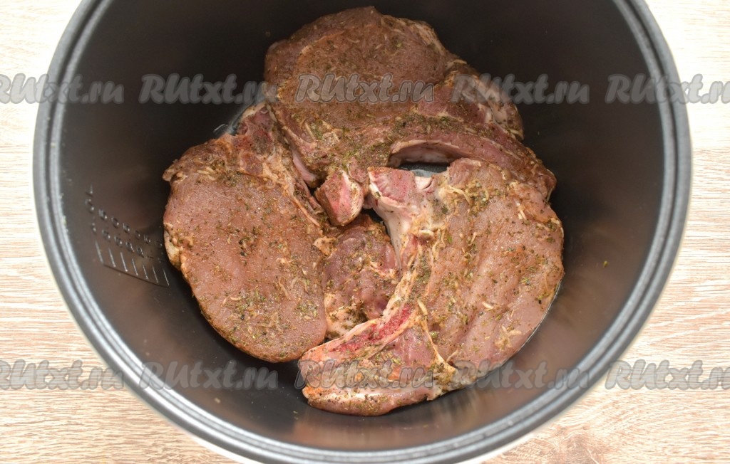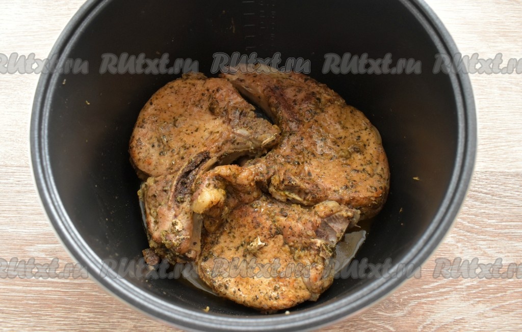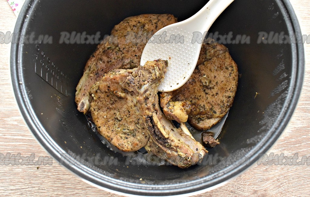 Вливаем растительное масло в съёмную чашу мультиварки, даём ему как следует прогреться. Затем выкладываем замаринованную свинину на кости в чашу в один слой.