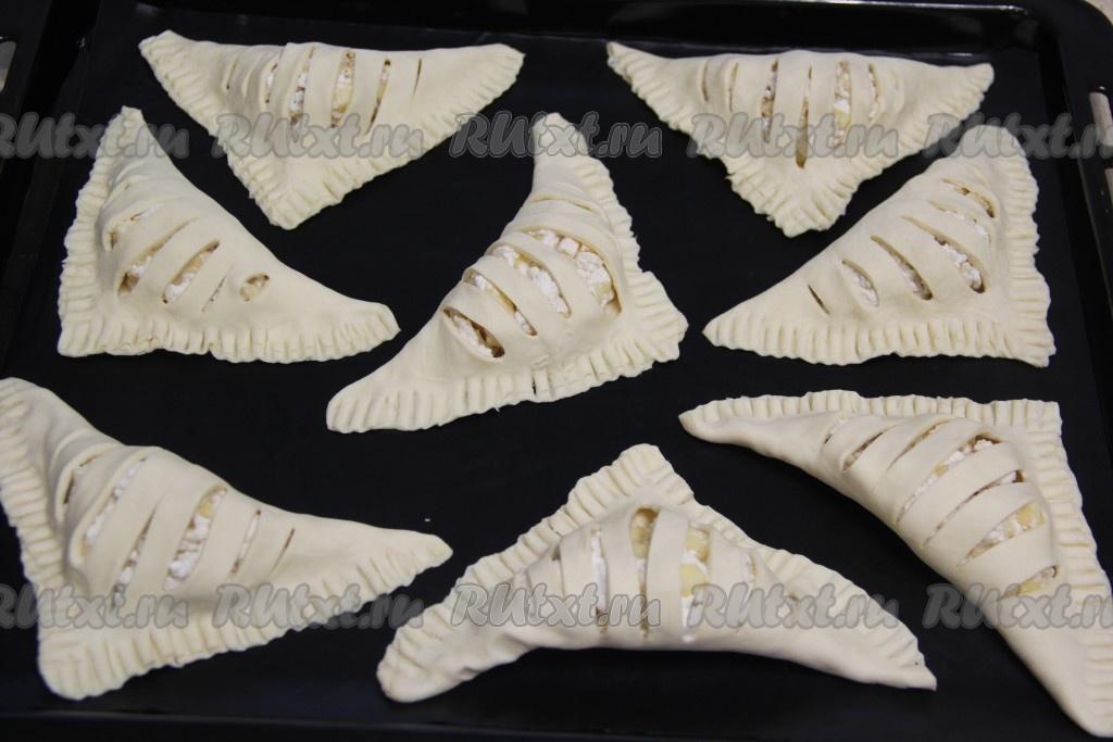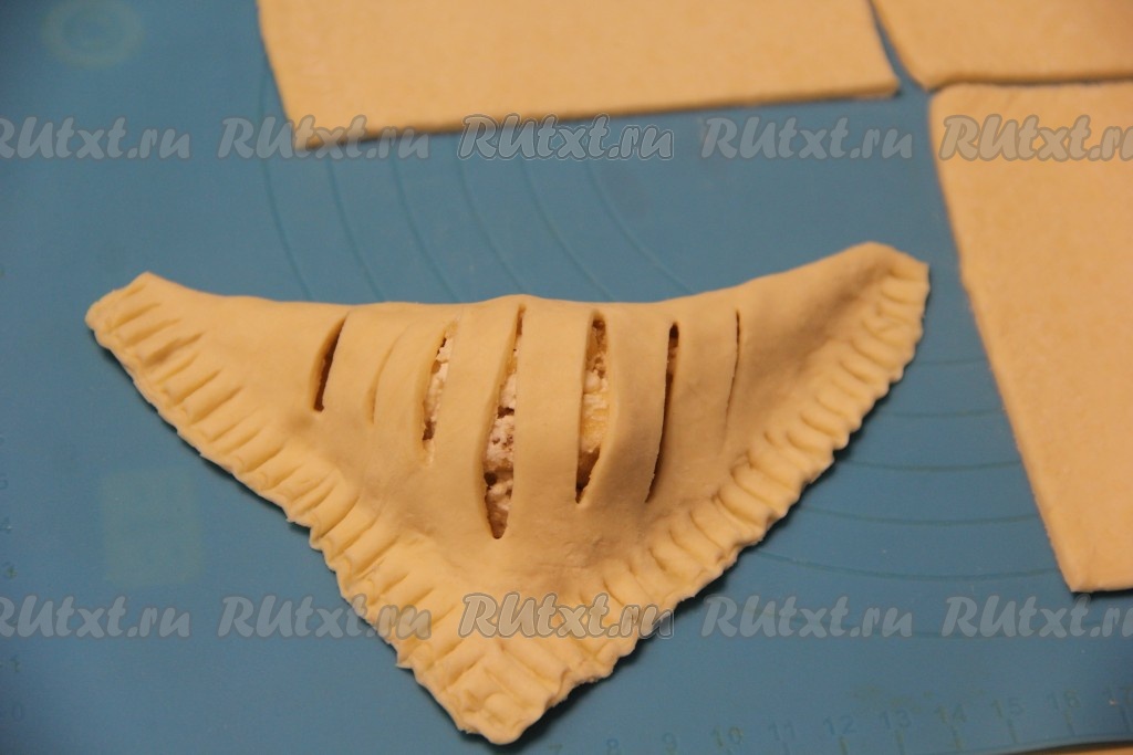 Частью теста с разрезами накрыть часть теста, на которую выложена начинка, получится треугольная слойка. Хорошо скрепить края теста, это удобно делать вилкой. Аналогично сформировать все слойки.