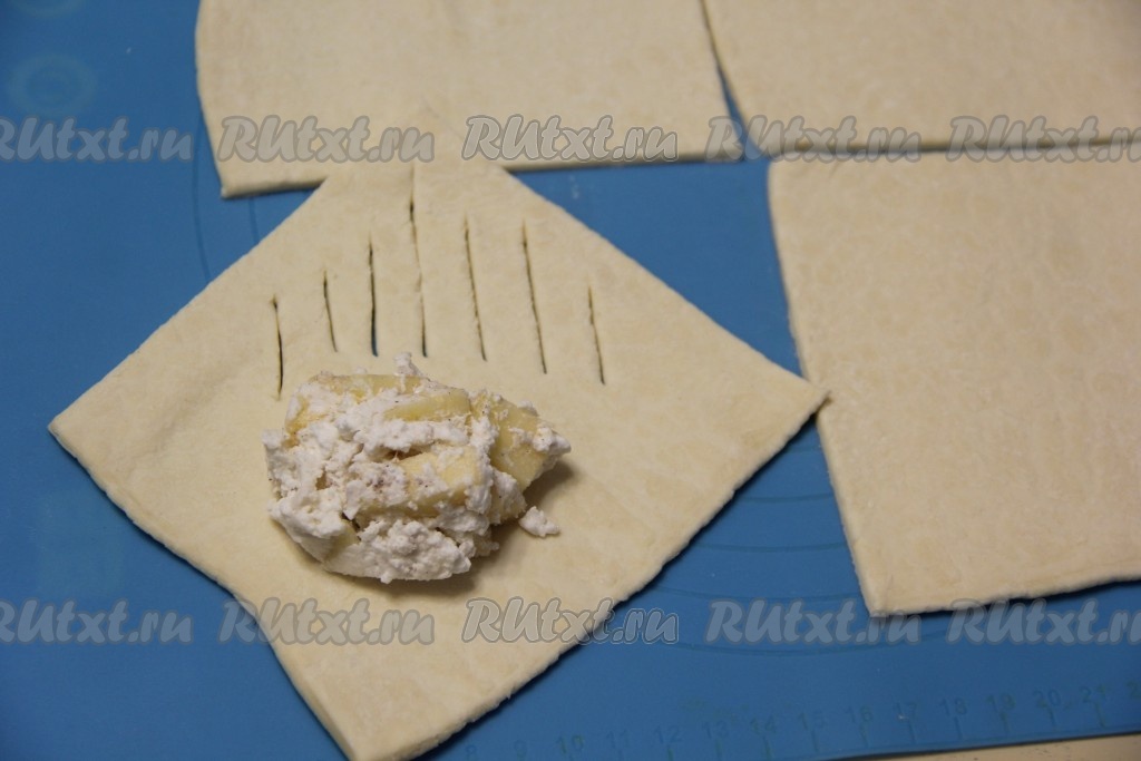 Каждый квадрат теста визуально поделить по диагонали на две части. Выложить на одну часть теста 1 столовую ложку с горкой начинки, а на другом крае квадрата сделать несколько разрезов ножом (как на фото).