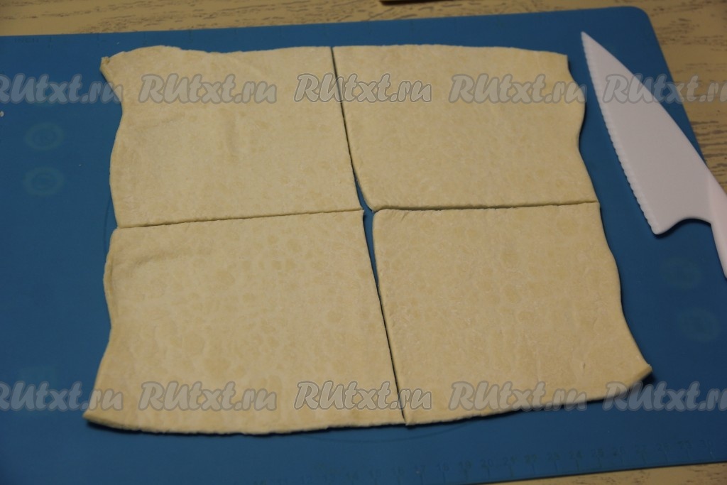 Разрезать каждый раскатанный пласт теста на 4 квадрата. В итоге из двух пластов теста у нас получится 8 слоек.