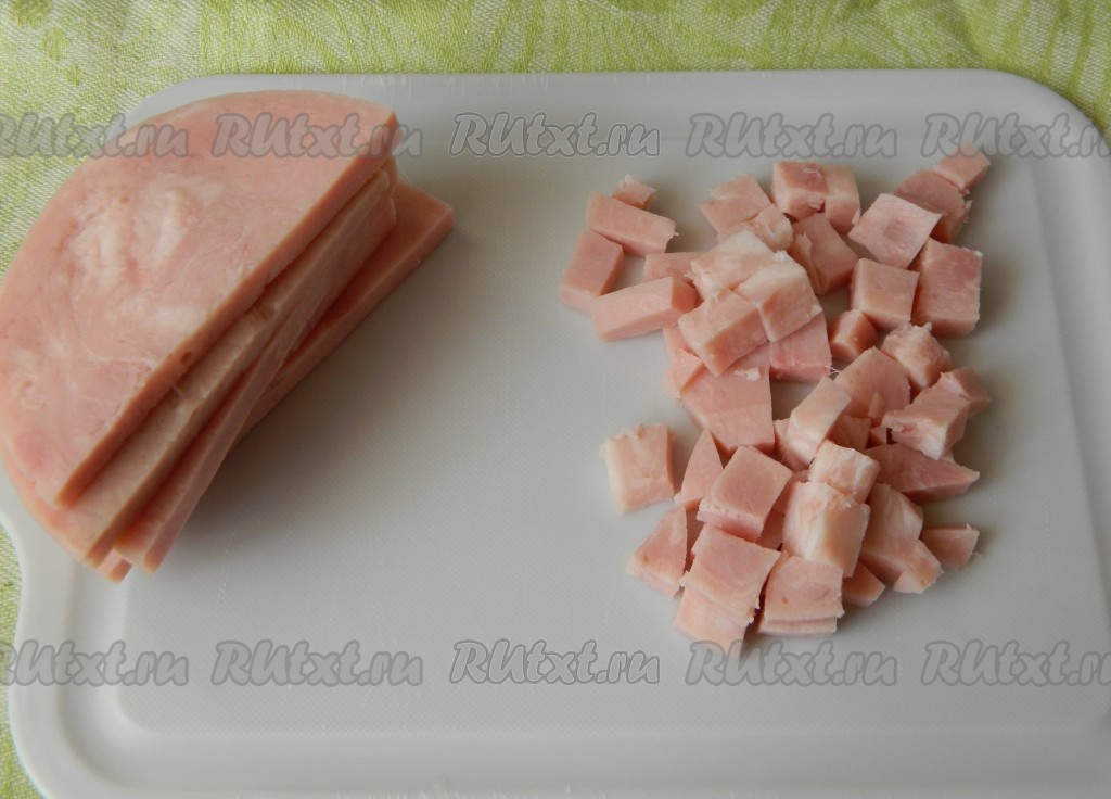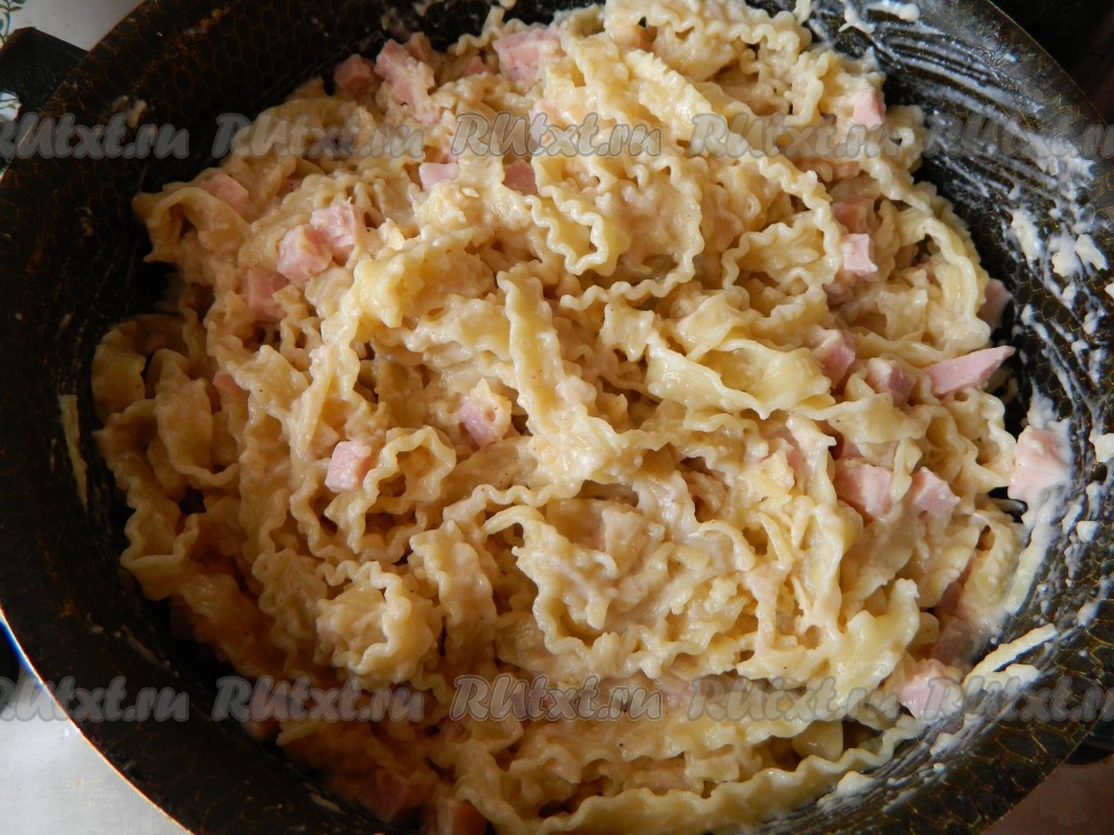 Очень вкусную лапшу, приготовленную с ветчиной и сыром, подаем к столу горячей.