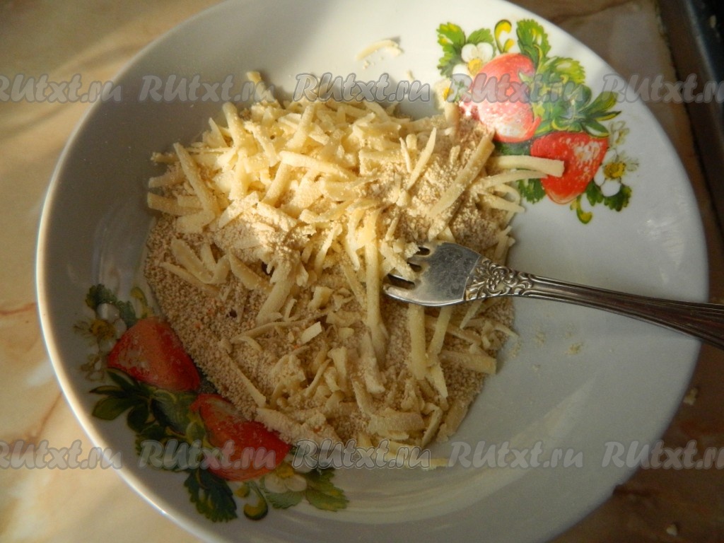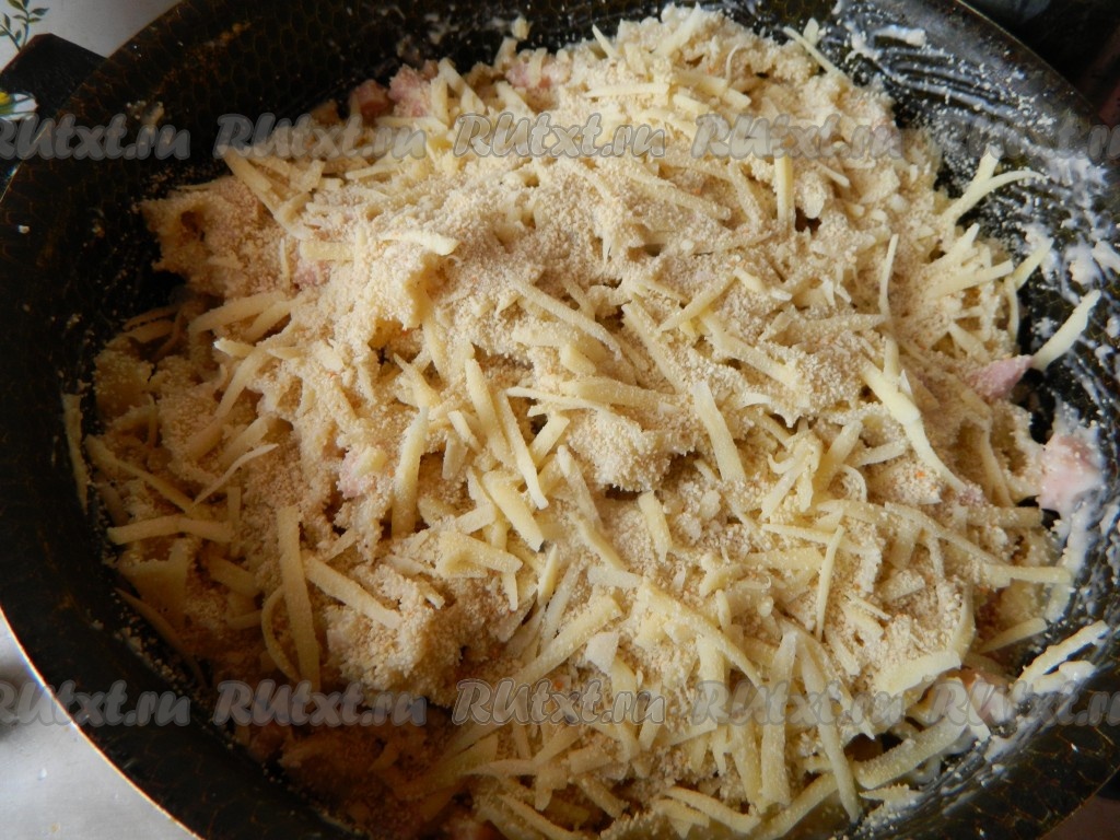 Сверху на лапшу выкладываем сыр с сухарями. На 8 минут ставим в разогретую духовку при температуре 180 градусов.