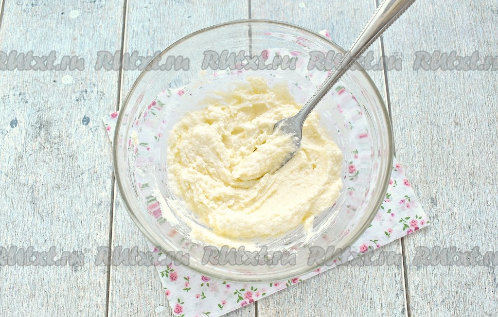 Вилкой хорошо перетираем маргарин с сахаром, чтобы получилась однородная масса. Мне потребовалось для этого 2 минуты.