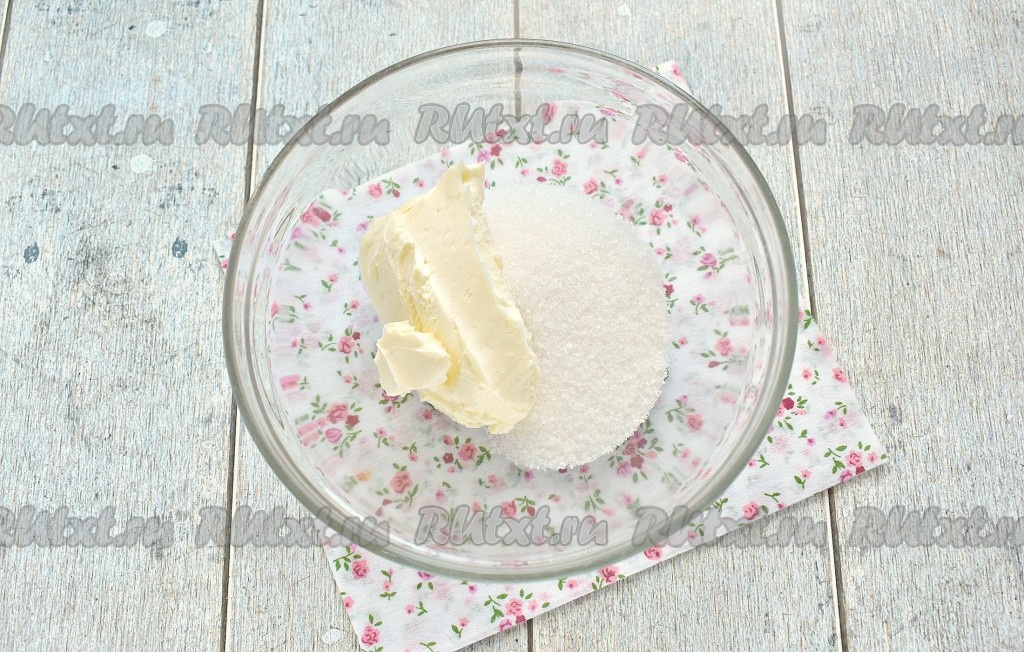 Заранее достаём из холодильника маргарин, чтобы он при комнатной температуре стал достаточно мягким. Перекладываем размягчившийся маргарин в миску, всыпаем к нему сахар (количество сахара, при желании, можно немного уменьшить).