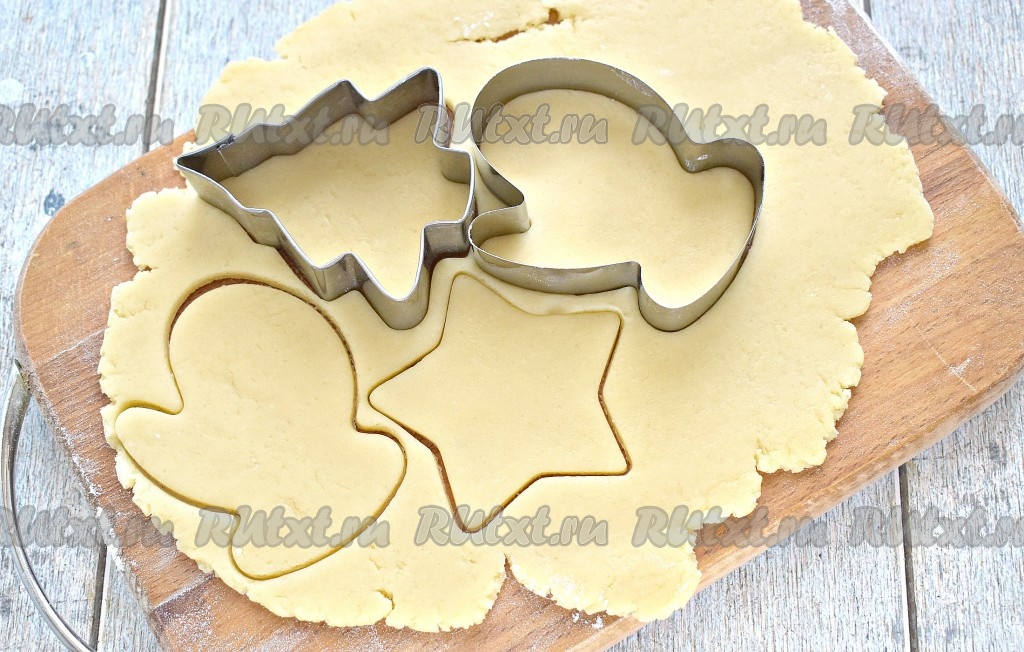 Холодное тесто на присыпанной мукой поверхности раскатываем в пласт толщиной, ориентировочно, 5-7 мм. Вырезаем с помощью вырубки (или стакана, или просто ножом) печенье желаемой формы.
