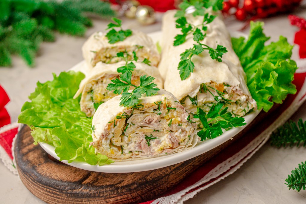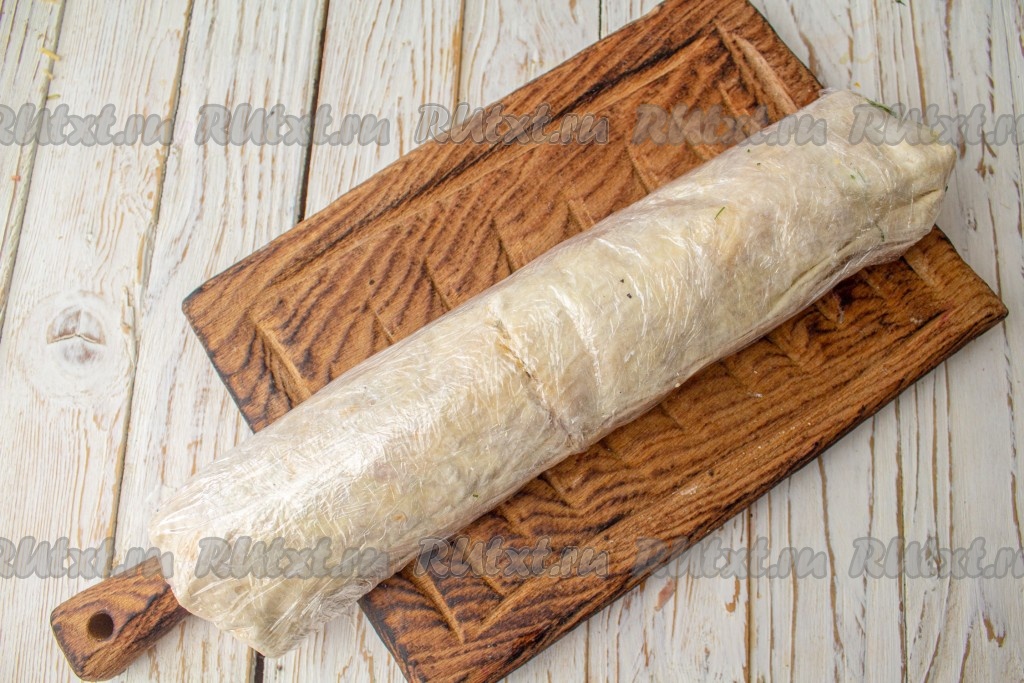 Сверните лаваш с начинкой в плотный рулет, затем заверните его в плёнку и поместите на несколько часов в холодильник.