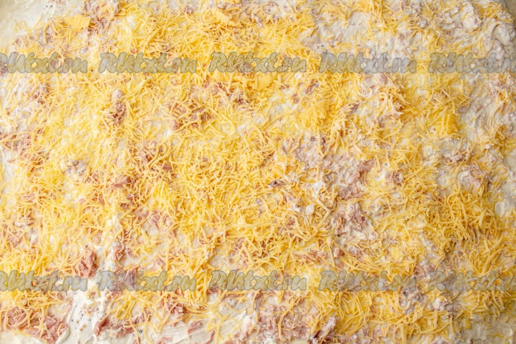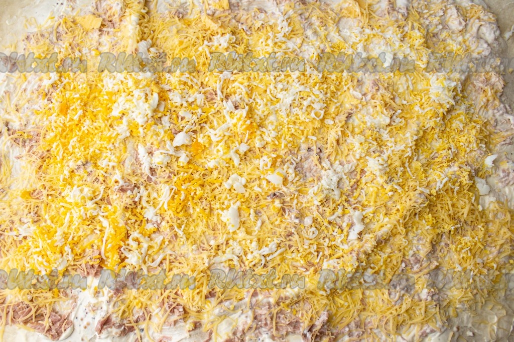 Сыр натрите на мелкой терке и распределите на лаваше следующим слоем.