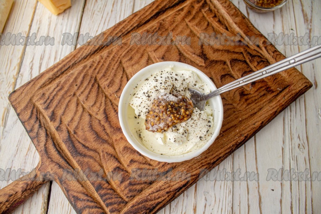 Для приготовления соуса в небольшой ёмкости смешайте сметану (или натуральный йогурт), горчицу, соль и чёрный молотый перец.