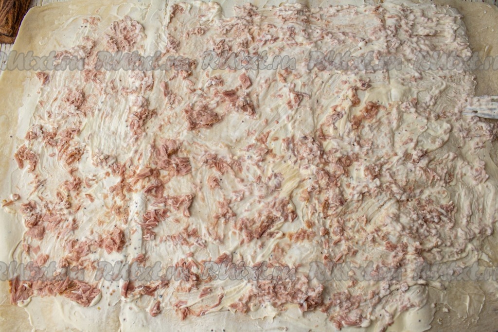 Из баночки с рыбой слейте лишнюю жидкость (эта жидкость нам в дальнейшем не потребуется), если нужно, рыбку разомните. Поверх лаваша, смазанного соусом, равномерно распределите кусочки консервированного тунца.