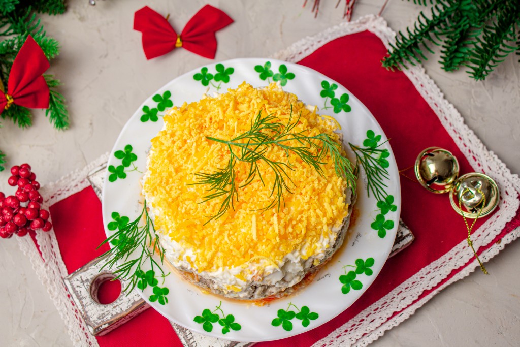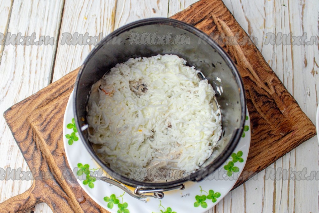 Разделите варёные яйца на белки и желтки. Белки натрите на мелкой тёрке и распределите ровным слоем на рыбу, смажьте оставшимся майонезом. При необходимости, посолите и поперчите по вкусу. Желтки отложите в сторону (они нам потребуются для покрытия верха салата).