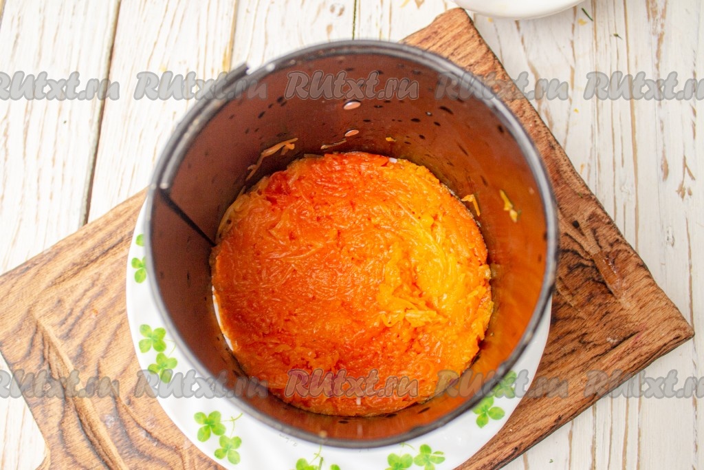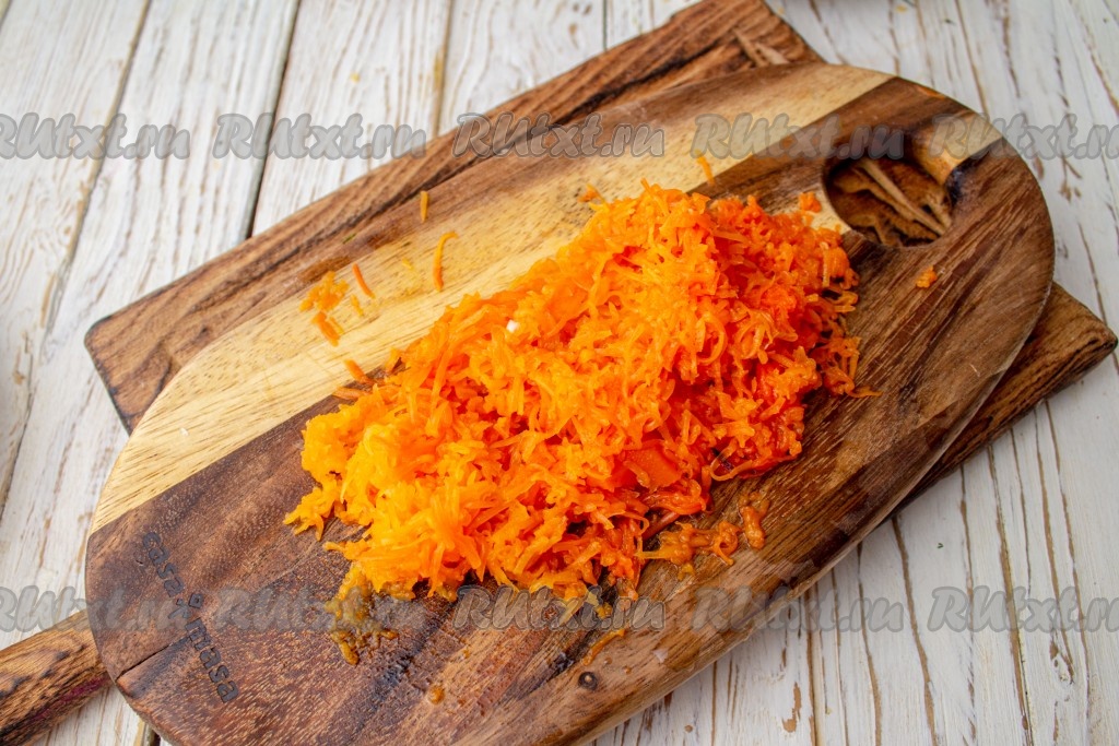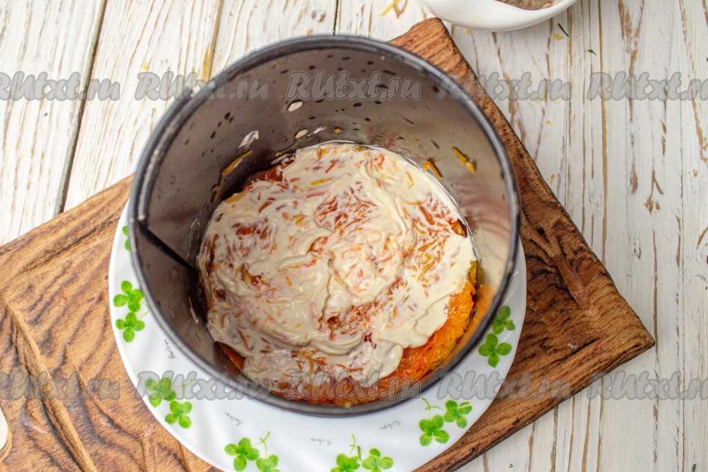 На плоское блюдо установите сервировочное кольцо (я использовала сервировочное кольцо диаметром 14 см), выложите плотным слоем морковь, слегка присолите.