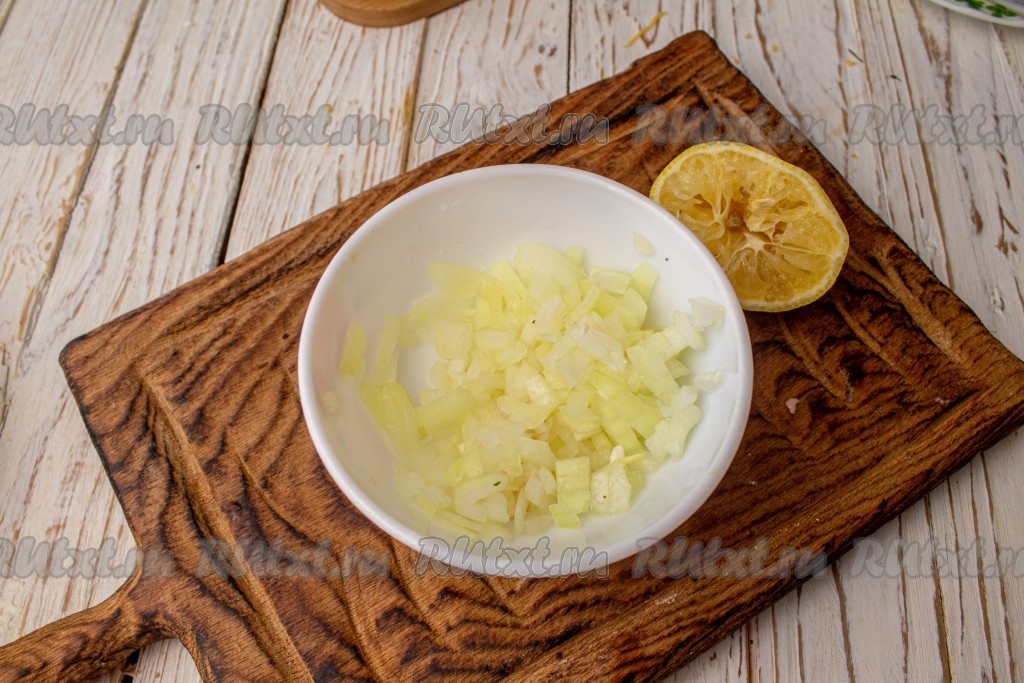 Очистите луковицу, нарежьте её на мелкие кубики, выложите в мисочку, залейте лимонным соком и перемешайте.
