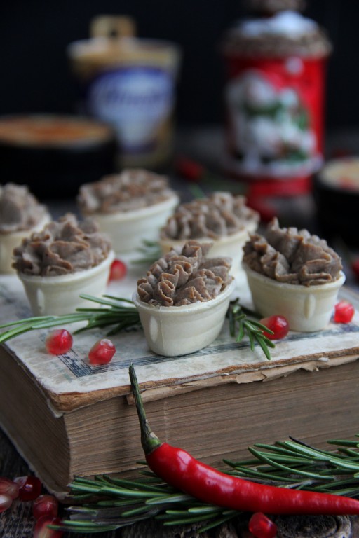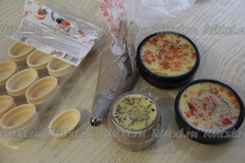 Поверх паштета я влила растопленное не горячее сливочное масло (в холодильнике масло застынет и образовавшаяся на поверхности паштета корочка не даст проникать воздуху внутрь банки), сверху масло, по желанию, можно присыпать тимьяном, паприкой или розмарином. Закрыть баночки и керамические формочки крышками и поставить в холодильник. Перед подачей печёночно-грибной паштет переложить в кулинарный мешок с фигурной насадкой. Тарталетки можно взять любые (у меня вафельные).