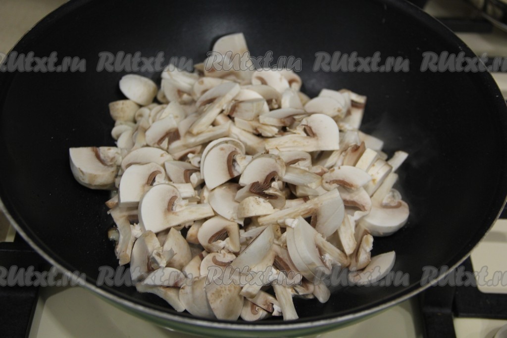 Шампиньоны промыть и нарезать на пластинки. В сковороду (у меня сковорода вок) влить немного масла и выложить нарезанные шампиньоны.