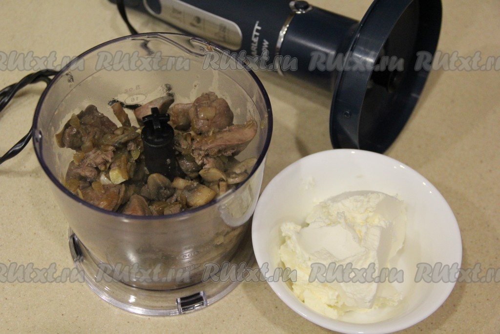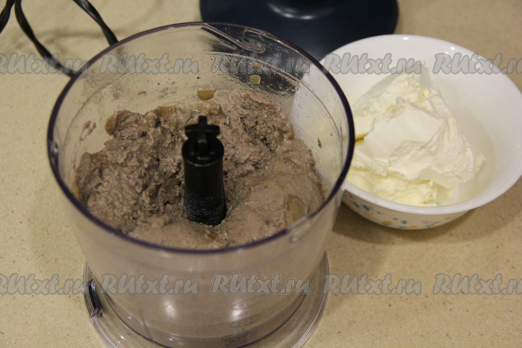 Пробить печёночно-грибной паштет до однородного и гладкого состояния. Добавить творожный сыр и ещё раз пробить до гладкого и однородного состояния.