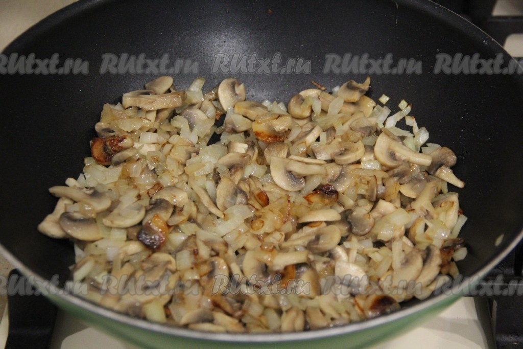 Грибы с луком обжаривать минут 7 минут, иногда перемешивая.