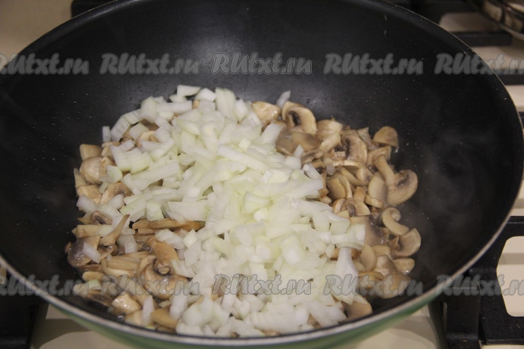 Обжарить грибы в течение 15 минут, помешивая. Затем к обжаренным шампиньонам выложить очищенный и мелко нарезанный лук.